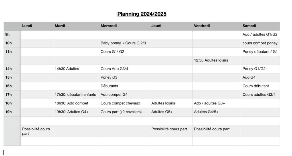 Le centre équestre propose des cours collectifs toute l’année scolaire (du mois de septembre au mois de juin), ou des cours particuliers à la demande. Nous accueillons les cavaliers du débutant au confirmé dès l’âge de 4ans. Nous adaptons nos leçons à vos envies et ambitions : ainsi certains cours d’équitation sont spécialement conçus pour les personnes ne souhaitant pas faire d’obstacles.